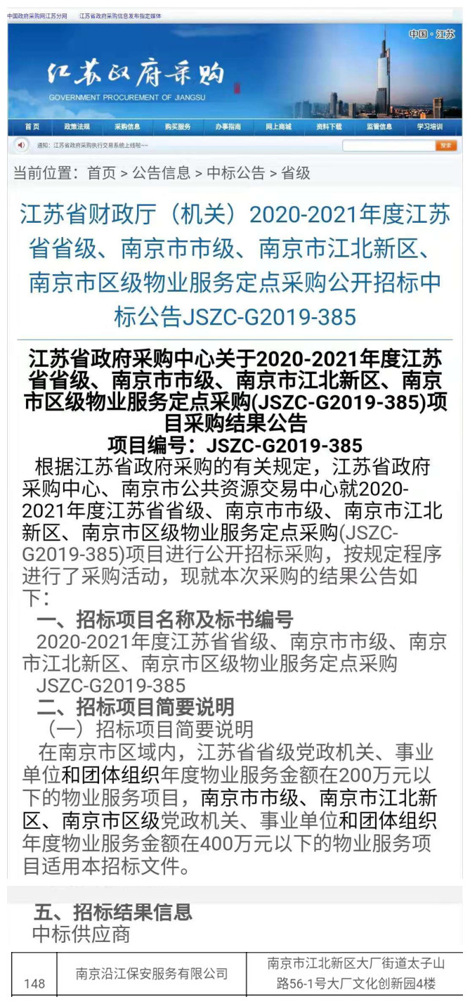 “南京沿江保安服務(wù)有限公司”憑借多年的積累和全體員工的辛苦付出、不懈努力,在本次招標(biāo)活動(dòng)中正式成為2020-2021年度江蘇省省級(jí)、南京市市級(jí)、南京市江北新區(qū)、南京市區(qū)級(jí)物業(yè)服務(wù)定點(diǎn)采購(gòu)指定單位。