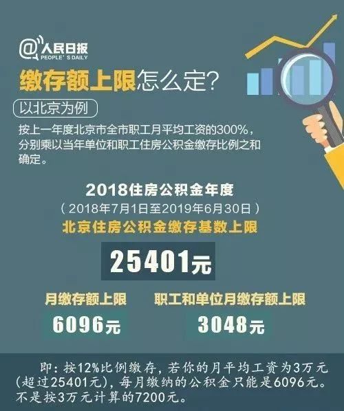 2018年住房公積金年度(即2018年7月1日至2019年6月30日)北京住房公積金繳存基數(shù)上限為25401元,月繳存額上限為6096元,職工和單位月繳存額上限均為3048元。